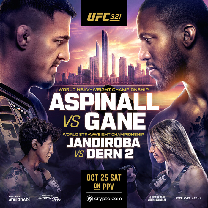 UFC 321: Aspinall vs. Gane is an upcoming mixed martial arts event produced by the Ultimate Fighting Championship that will take place on October 25, 2025, at the Etihad Arena in Abu Dhabi, United Arab Emirates.