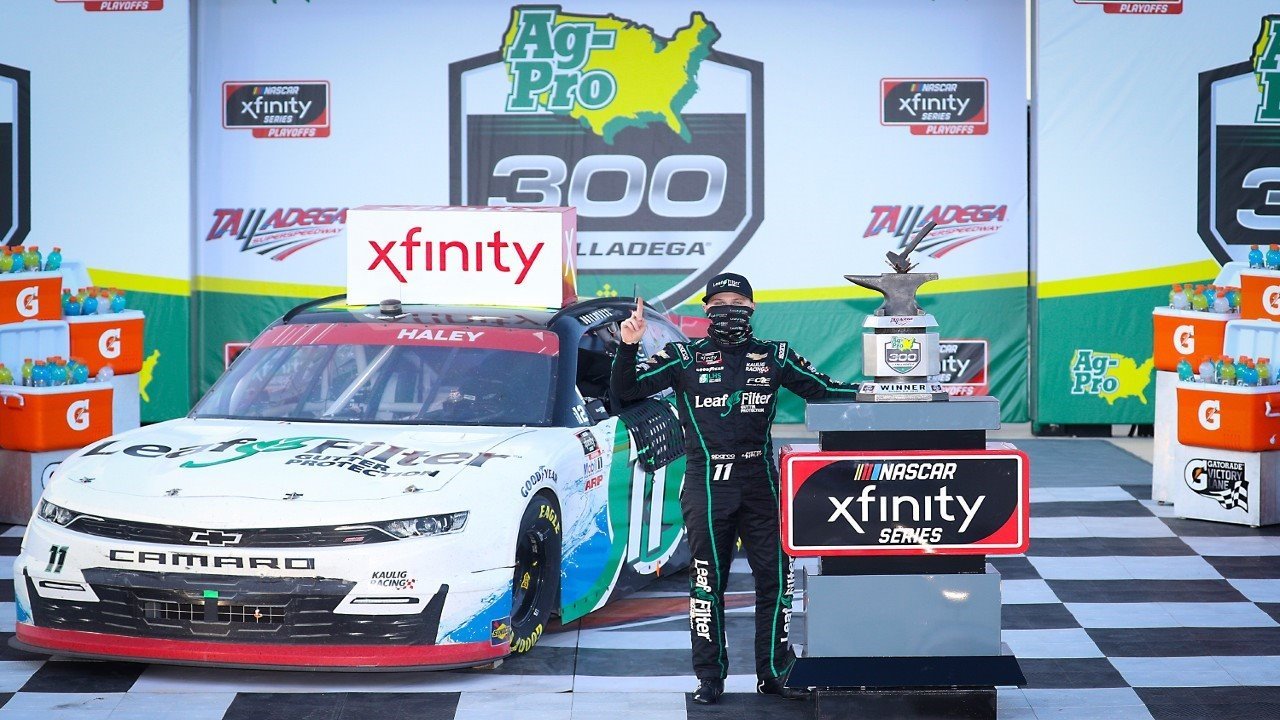 Description Grabbing the lead on Lap 112 of 113, Haley earned a spot in the Round of 8 in the NASCAR Xfinity Series Playoffs with the victory in the second Round of 12 race, his third of the season, the third of his career and his third straight in an Xfinity superspeedway event, a streak matched only by the late Dale Earnhardt and Dale Earnhardt Jr.