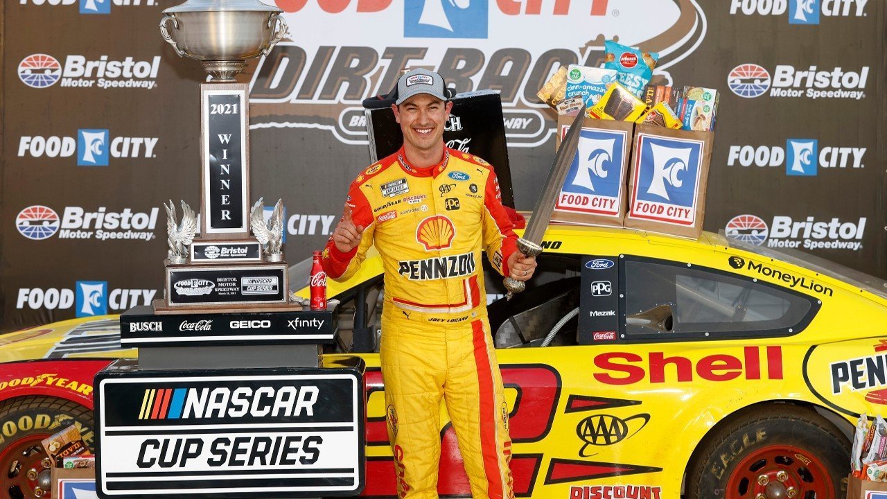 Leading the final 61 laps in the face of a determined charge by Denny Hamlin, Logano won the rain-delayed Food City Dirt Race in overtime at Bristol Motor Speedway, the first dirt-track race for the NASCAR Cup Series since 1970.