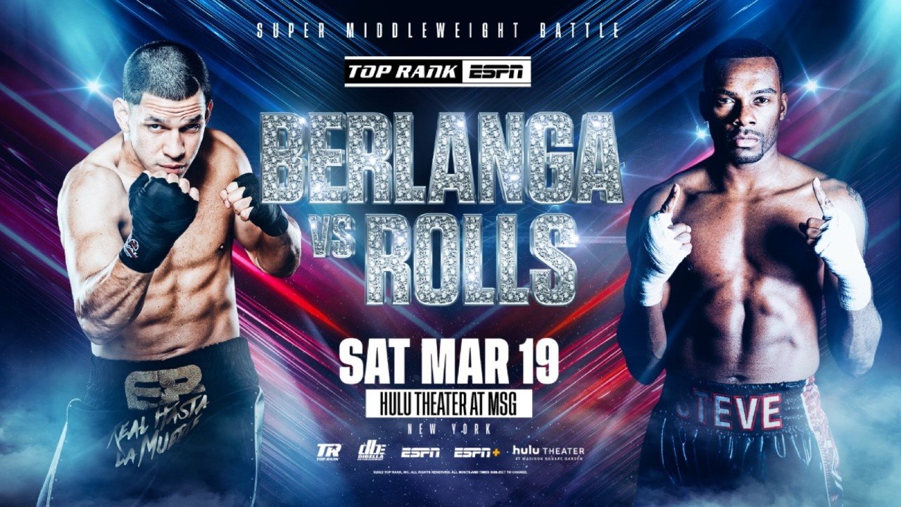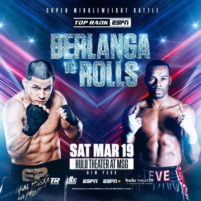 Description Brooklyn-born super middleweight sensation Edgar “The Chosen One” Berlanga will defend his NABO belt against crafty Canadian Steve Rolls in the 10-round main event Saturday, March 19 at Hulu Theater at Madison Square Garden. Berlanga, whose family hails from San Juan, Puerto Rico, makes his main event debut in his stiffest test to date.