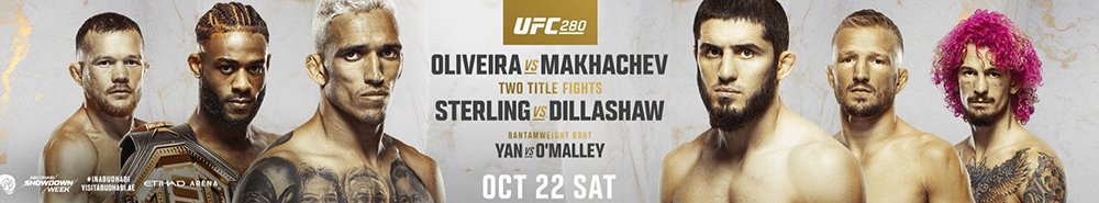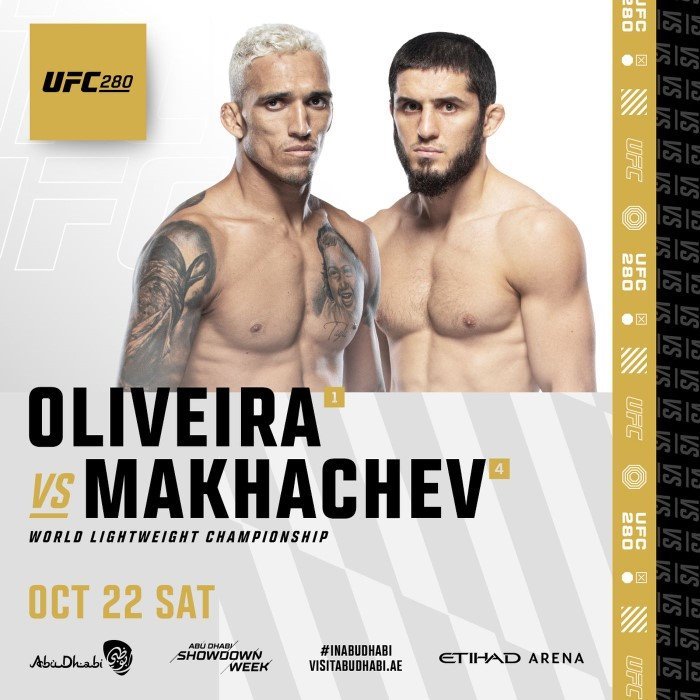 UFC 280: Oliveira vs. Makhachev was a mixed martial arts event produced by the Ultimate Fighting Championship that took place on October 22, 2022, at the Etihad Arena in Abu Dhabi, United Arab Emirates.