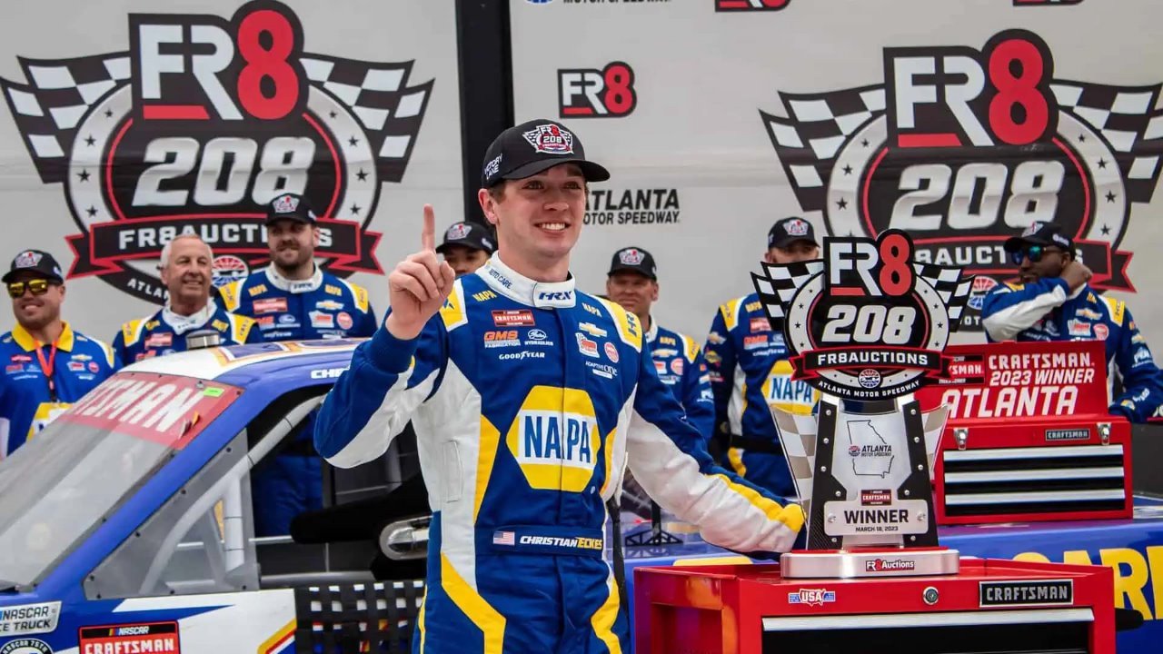 The 2023 Fr8Auctions 208 was the 3rd stock car race of the 2023 NASCAR Craftsman Truck Series, and the 15th iteration of the event. The race was held on Saturday, March 18, 2023, in Hampton, Georgia, at Atlanta Motor Speedway, a 1.54 miles (2.48 km) permanent tri-oval shaped superspeedway. The race was increased from 135 laps to 137 laps, due to a NASCAR overtime finish. Christian Eckes, driving for McAnally-Hilgemann Racing, would take the win after making a pass on Nick Sanchez for the lead on the final lap. This was Eckes' second career NASCAR Craftsman Truck Series win, and his first of the season. This was also the first win for McAnally-Hilgemann Racing in the truck series. To fill out the podium, Sanchez, driving for Rev Racing, and John Hunter Nemechek, driving for TRICON Garage, would finish 2nd and 3rd, respectively.