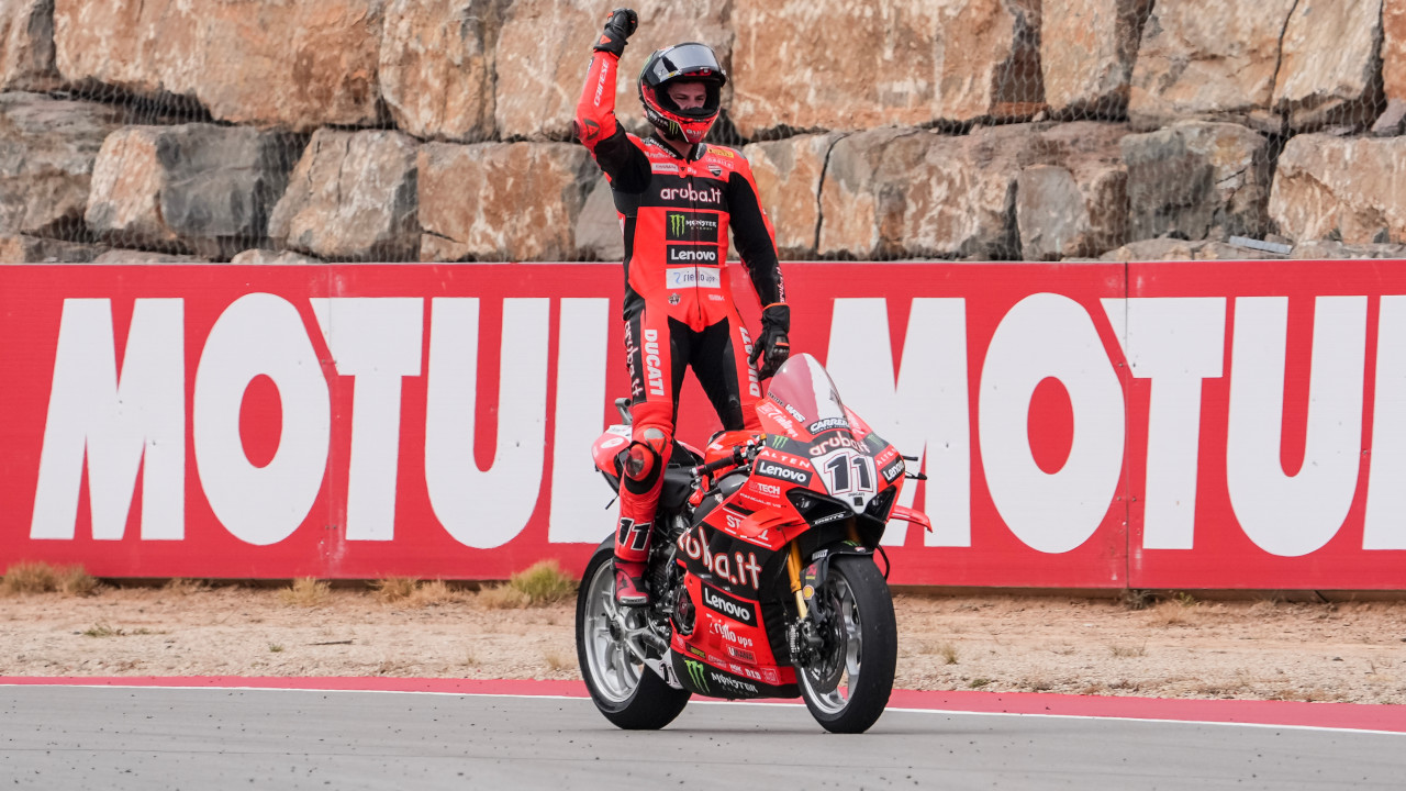 Description Nicolo Bulega (Aruba.it Racing - Ducati) made it two from two on Sunday at MotorLand Aragon in the MOTUL FIM Superbike World Championship as ‘Bulegas’ came out on top after another incredible fight between the #11 and Toprak Razgatlioglu (ROKiT BMW Motorrad WorldSBK Team). The Ducati star came out on top as they both got their elbows out for the third time at the Tissot Aragon Round.