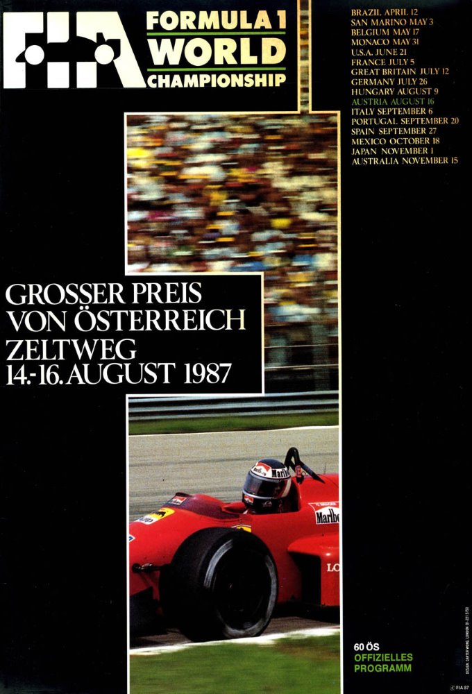 Description The 1987 Austrian Grand Prix was a Formula One motor race held at Österreichring on 16 August 1987. It was the tenth race of the 1987 Formula One World Championship. It was the twentieth Austrian Grand Prix, and the last to be held until 1997. The race was run over 52 laps of the 5.94-kilometre (3.69 mi) circuit for a total race distance of 308.9 kilometres (191.9 mi), also being the last race in the original track.