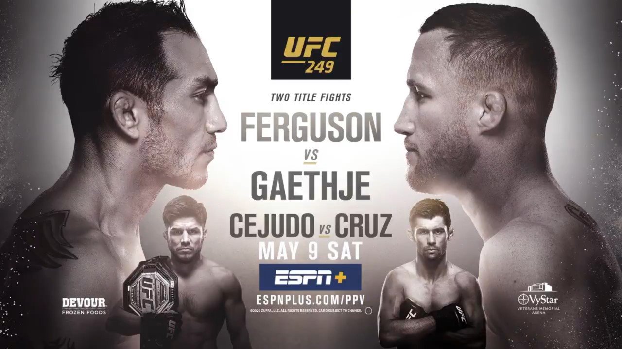 Description UFC 249: Ferguson vs. Gaethje is a mixed martial arts event produced by the Ultimate Fighting Championship expected to take place on May 9, 2020 at VyStar Veterans Memorial Arena in Jacksonville, Florida, United States. It was originally planned to take place on April 18 at Barclays Center in Brooklyn, New York, United States. Due to the COVID-19 pandemic, the event was eventually postponed (see section below). On April 21, the UFC confirmed that UFC 249 would be moved to May 9 and also expected to take place in Florida.