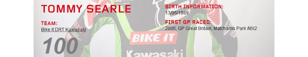 Tommy Searle (born 13 June 1989) is a British professional motocross and supercross racer who competes in the MXGP class of the FIM Motocross World Championship for the Bos gp Kawasaki team.