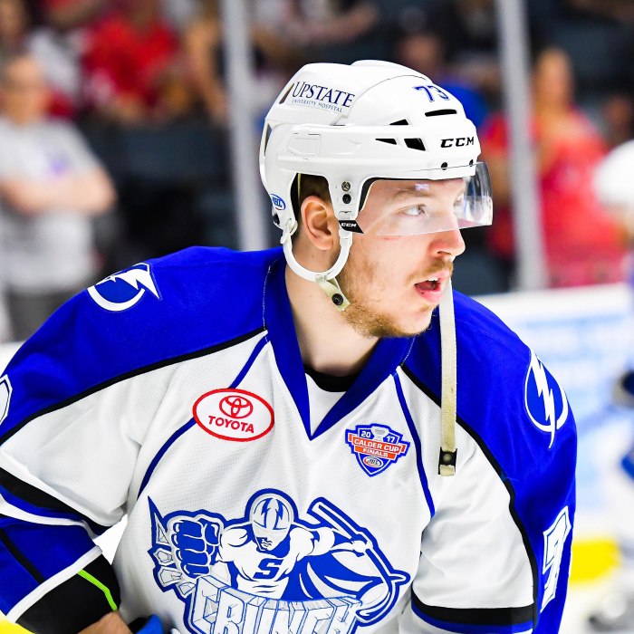 On January 2, 2017, the Lightning recalled Erne from the Syracuse Crunch. On January 3, 2017, Lightning head coach, Jon Cooper, informed the media that Erne would be making his NHL debut. Erne found out that he was making his NHL debut when he walked into the room that morning and saw his number on the board. Erne made his NHL debut that night against the Winnipeg Jets. On March 3, 2017, Erne recorded his first career NHL goal and point against the Pittsburgh Penguins at PPG Paints Arena. On March 20, 2018, Erne recorded his first career NHL assist. The assist came in a 4–3 Lightning win over the visiting Toronto Maple Leafs.