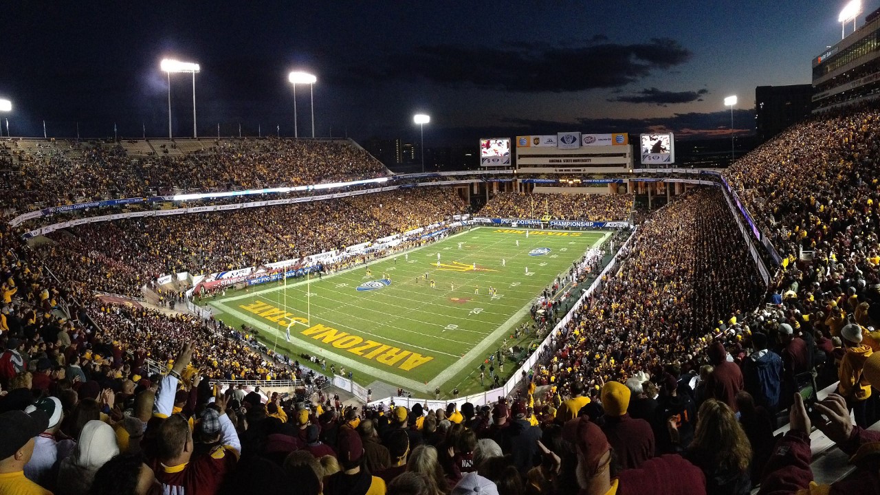 Sun Devil Stadium is an outdoor football stadium on the campus of Arizona State University in Tempe, Arizona, United States. It is home to the Arizona State Sun Devils football team of the Pac-12 Conference. The stadium's seating capacity as of 2018 is 53,599, reduced from a peak of 74,865 in 1989. The natural grass playing surface within the stadium was named Frank Kush Field in 1996 in honor of the former coach of the Sun Devil football team. The stadium underwent a five-year, $304-million renovation that was completed in August 2019. It was the only major football stadium in the Phoenix metropolitan area until the construction of State Farm Stadium in Glendale in 2006.