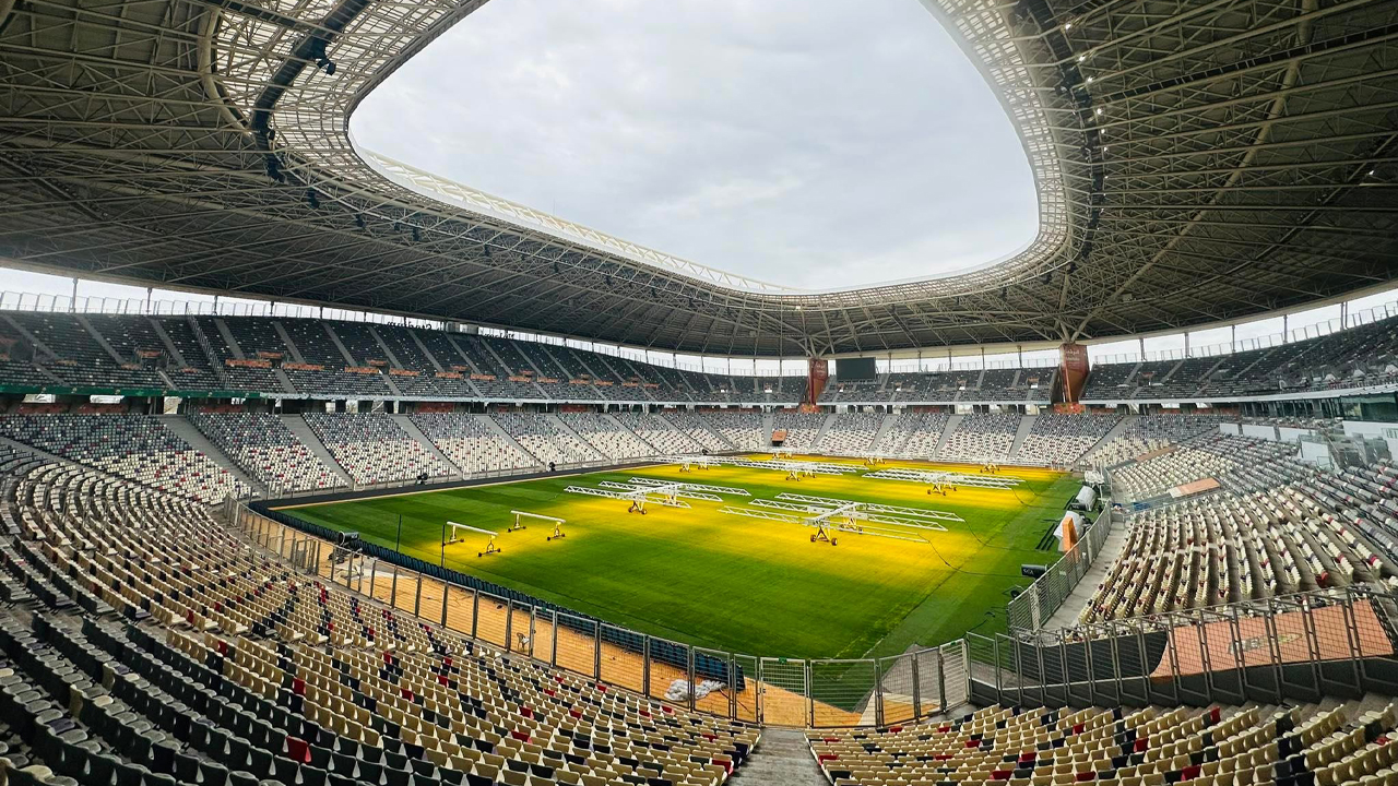 The sports infrastructure includes ancillary spaces including 50 accommodation rooms including two suites, a car park with a capacity of 6,000 vehicles on an area of 13 ha, a heliport for emergencies or the reception of official delegations, a replica field as well as green spaces. The stadium also has four changing rooms, dressing rooms for the referees, a medical area, a medical analysis laboratory, a hall of honor, a presidential stand, a conference room of 258 seats, a press area, radio and television broadcasting studios, three simultaneous interpretation studios, three 1,000-seat restaurants, fast food areas and other infrastructure.